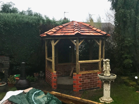 Work commenced, so within a short time the old greenhouse was removed completely. We marked out the area and dug a suitable foundation then filled with concrete ready to accommodate the new brick base. Reclaimed victorian bricks were selected as they perfectly match the current style of garden, matching the adjacent brick barbecue and reclaimed blue brick paths. The next task after completing the brickwork was to install the timber framework of the structure. 4” round posts were raised from each corner with supports underneath. Subsequently, the wall plate was attached and roof tiling could commence. The use of cedar wood shingles provides a traditional and subtle roofline appearance and provides a highly durable roof due to the high resin content within the timber. They were secured with stainless steel nails, special hip tiles (used on each edge) and then it was finished off with a brass finial. Many different types of flooring were suggested however we chose to use a mosaic victorian floor tile as they give a striking appearance visually and complement the rest of the structure. Final touches included fitting of lights around the perimeter and installing a plug socket to the inside.